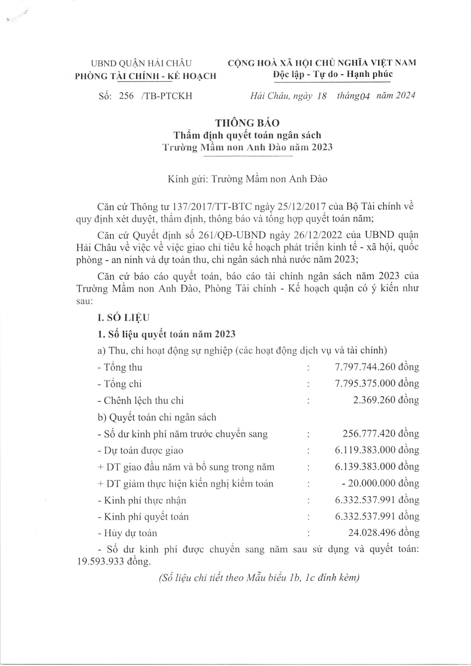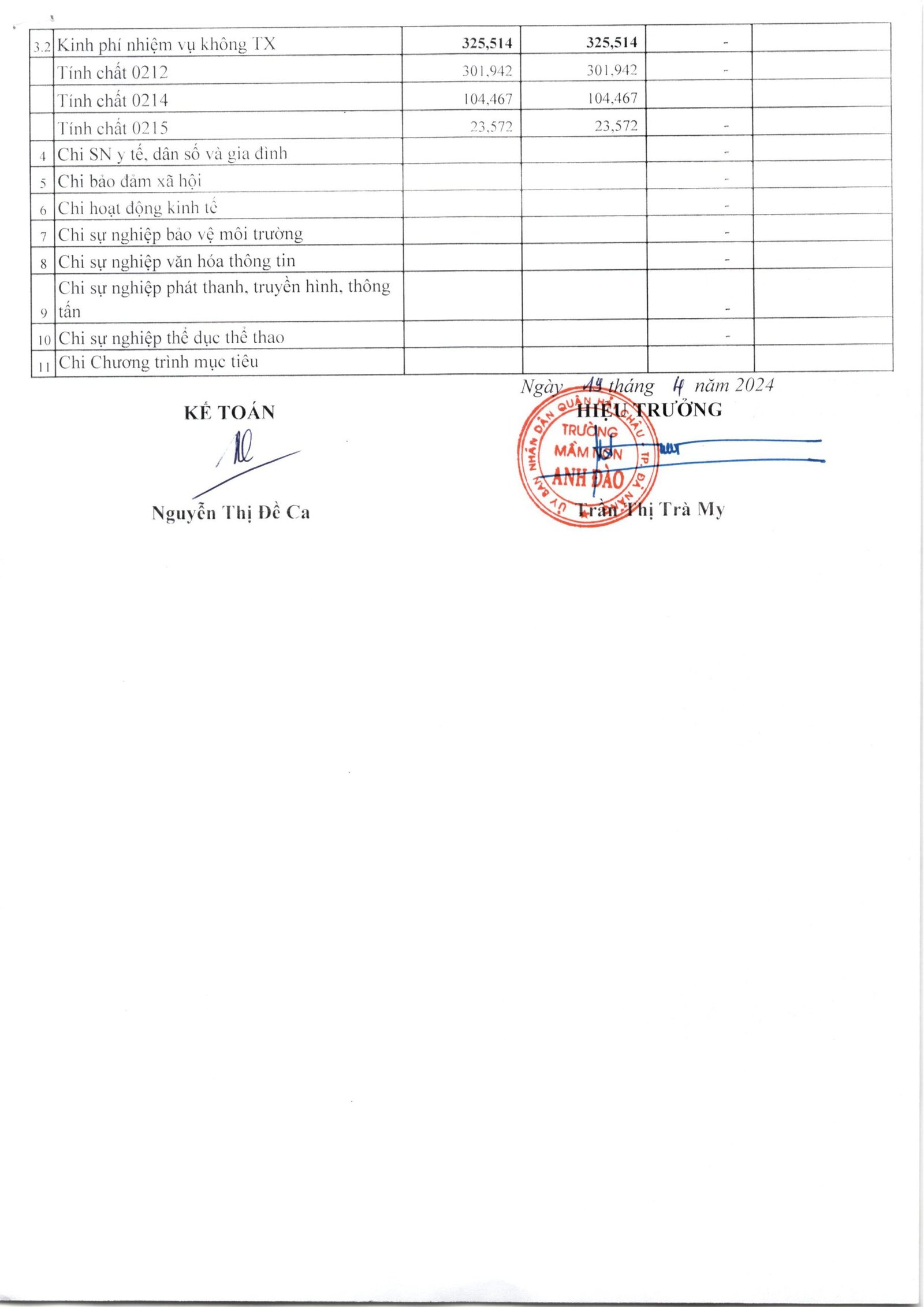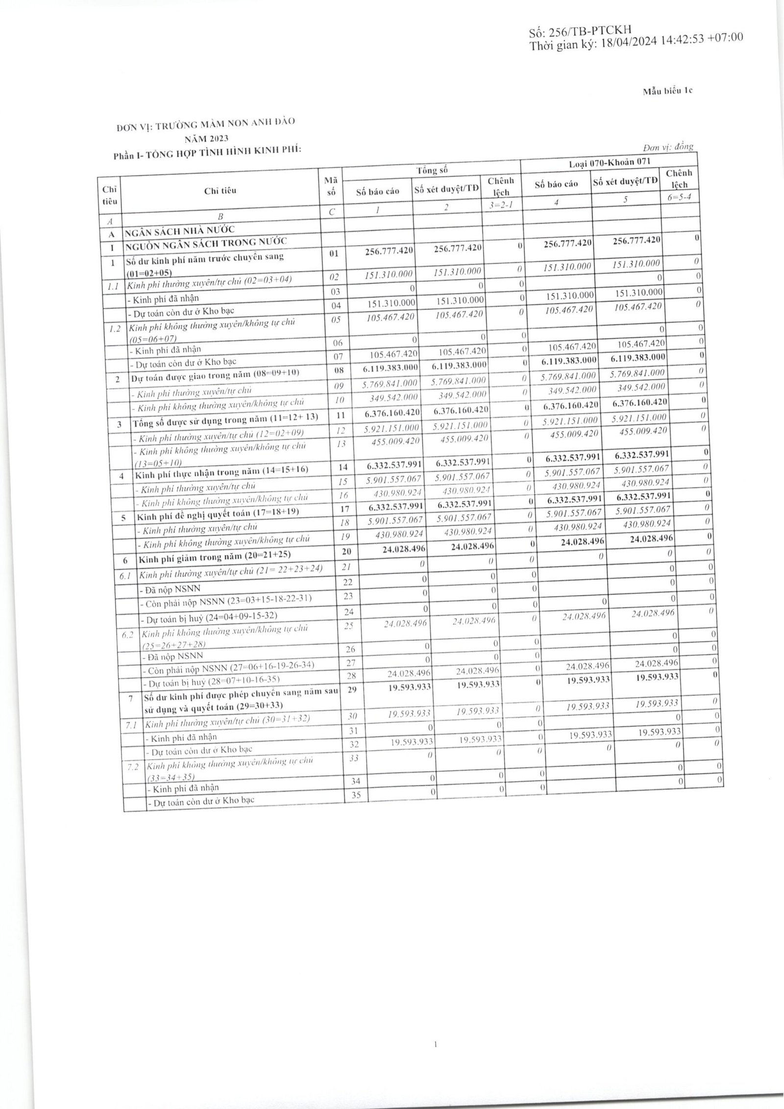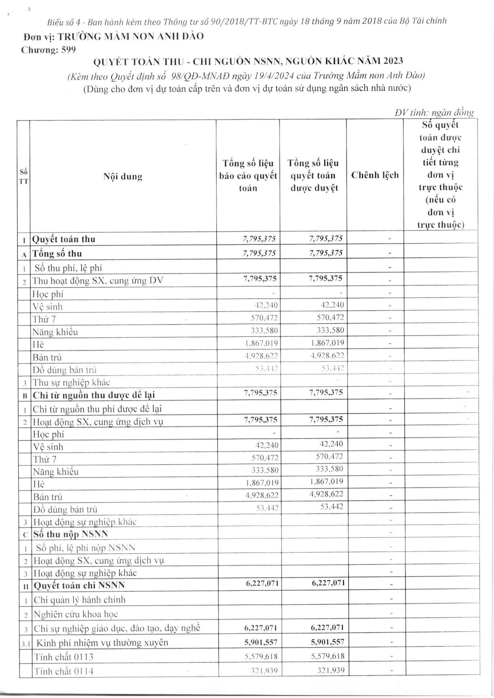 Công khai quyết toán ngân sách năm 2023 của trường Mầm non Anh Đào