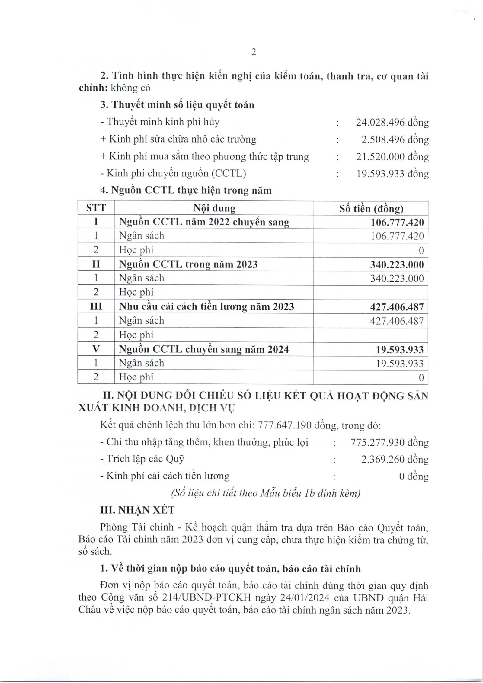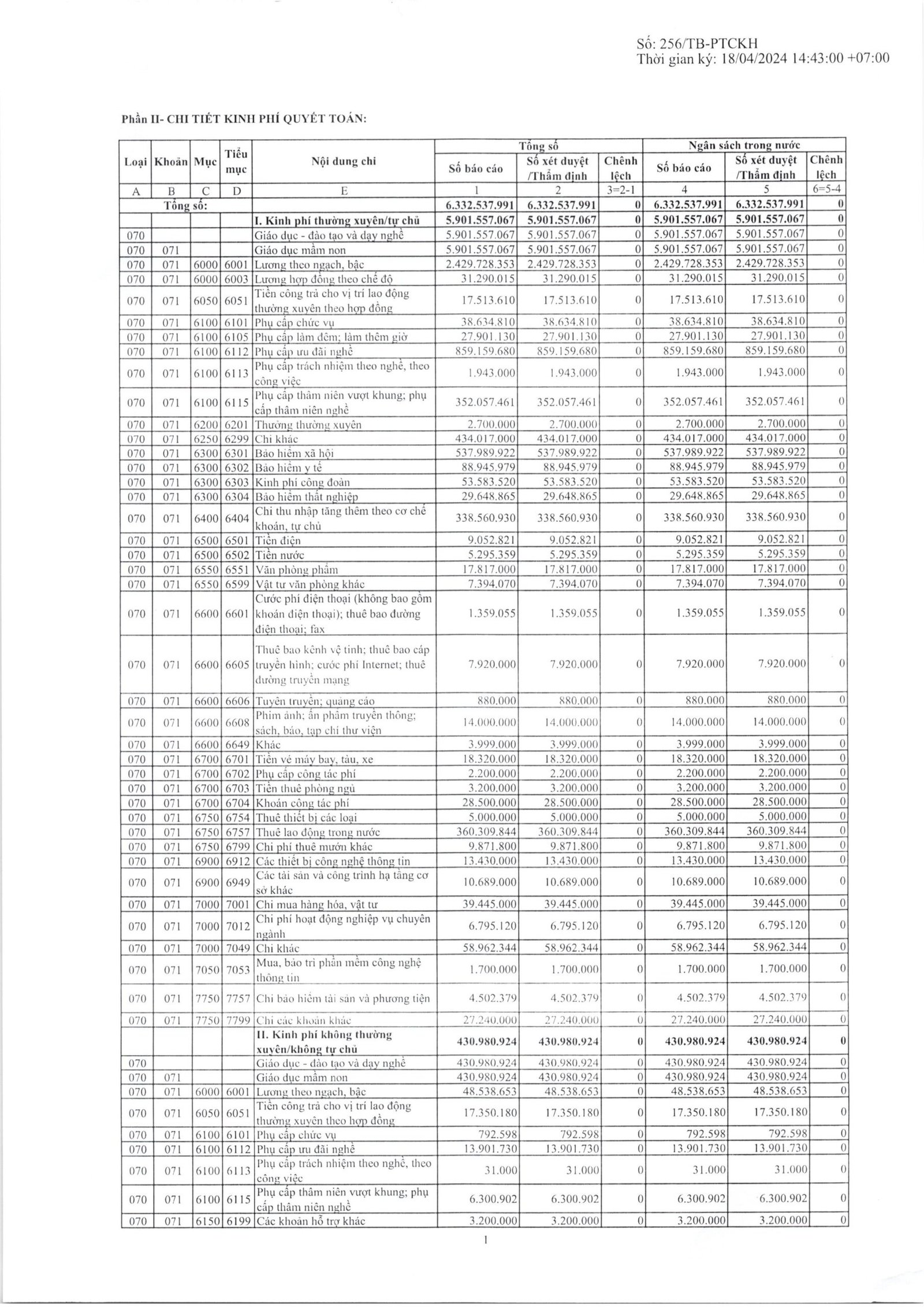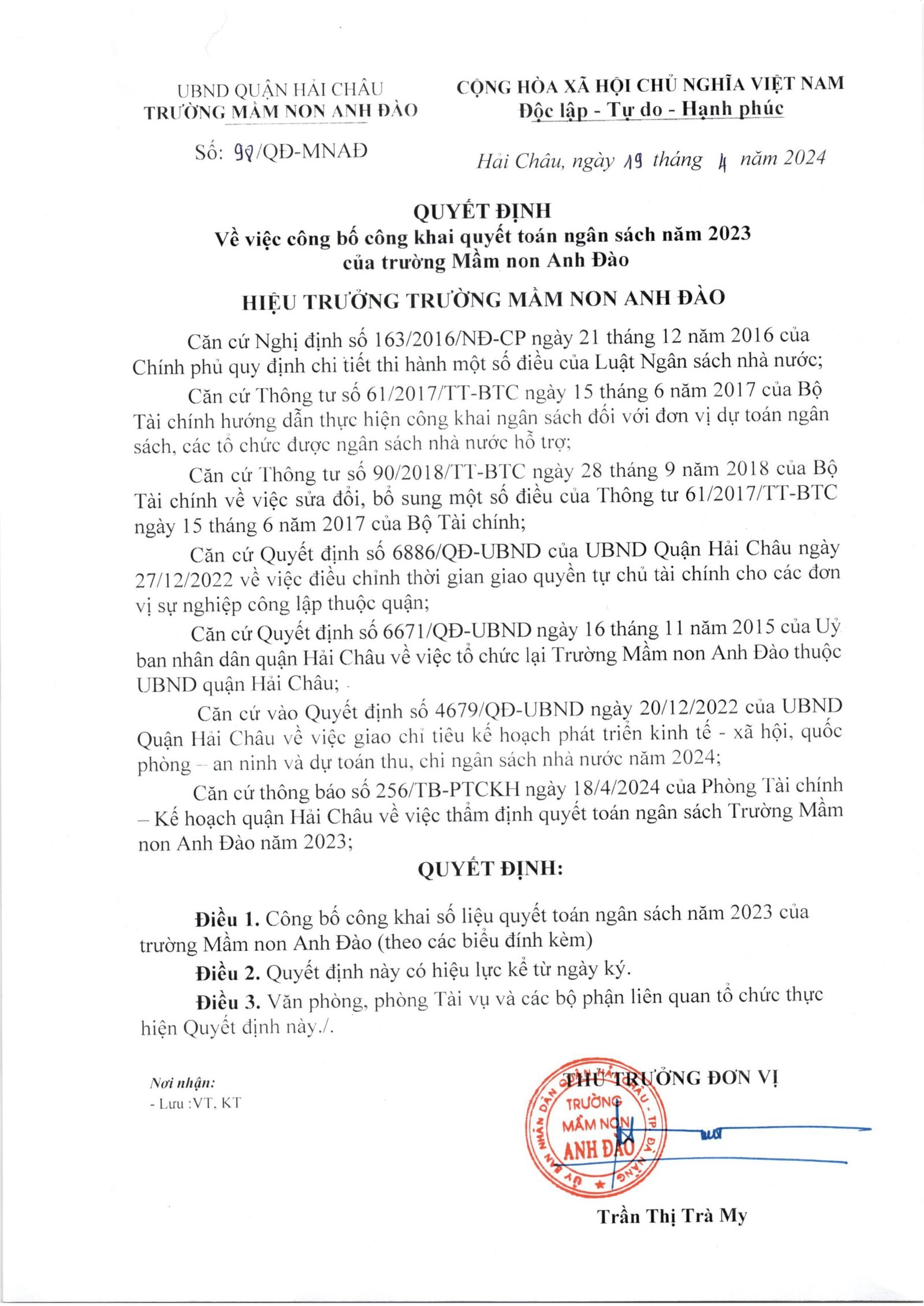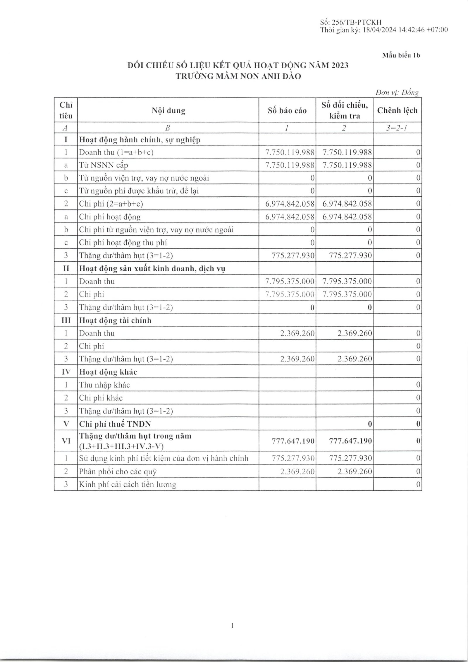 Công khai quyết toán ngân sách năm 2023 của trường Mầm non Anh Đào